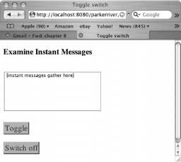 </head>With the setup complete, let's take a look at how easy it is to include a useful control or effect with your Ajax application. Toggling and SwitchingSome applications need to be able to show or hide a control or page region, depending on what the user wants to do with the application. For example, this hack contains a textarea that shows instant messages, similar to an emailer that auto-fetches emails. The application enables users to show or hide the textarea (in other words, to get it out of the way when they are not examining their messages). The hack uses the toggle effect of Prototype and the SwitchOff effect of script.aculo.us. Figure 8-1 shows the section of the web page that contains a viewport for instant messages. Figure 8-1. Embed script.aculo.us controls in a view