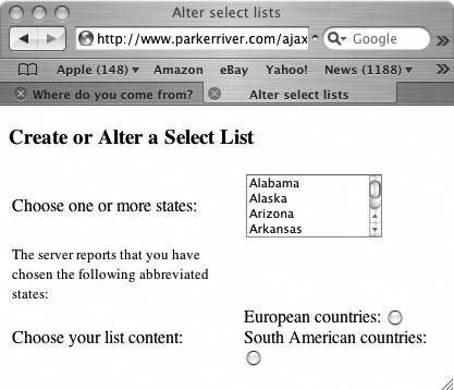 Create a list of choices on a web page that automatically branches into a new selection list without the entire page being refreshed. Sometimes a choice in a user interface naturally leads to a subsequent set of choices. An example is a support page for computer hardware, where one select list has a choice for hardware platform, such as Apple or HP, which generates (when the user makes a choice) a second list of related operating systems, and so on. Ajax can shine in these situations where the user interface can automatically be customized for the browser user, as well as where the content for the select list must come from a server. You could set up this page using only dynamic HTML, with JavaScript creating the new select list. However, the choices for the new list would have to be hardcoded into the JavaScript. Ultimately, this content for new lists will change, creating an awkward situation in which developers have to constantly add persistent lists to an existing JavaScript file. Without being able to store these values in a sensible location such as a database or other persistent store, this application model becomes unwieldy. This hack displays two radio buttons on a web page, offering users the choice of displaying either European countries or South American countries. Either choice results in the display of a new selection list with different content. Figure 2-6 shows the web page for the hack. Figure 2-6. Dynamically generate a list widget by selecting a radio button
