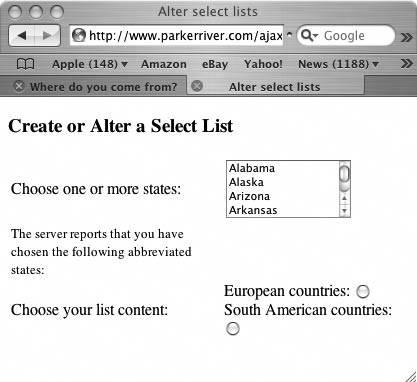 Whisk the user's multiple list choices off to the server without delay. Many web developers will see the advantage of sending a user's multiple choices in a radio button or select list directly to a server program using the request object, rather than requiring the user to click a button and send the entire form. This gives the application greater responsiveness and increases efficiency by sending discrete values rather than clumps of information. This hack sends the user's choices of U.S. states to a server program when the keyboard focus is moved away from the select list. The select element looks like this in the HTML code that underlies the web page: <select name="_state" multiple="multiple" size="4"> This is a selection list that allows the user to choose more than one item. When the keyboard focus moves from the select list (because the user presses the Tab key or clicks elsewhere on the page), the code defined by the element's onblur event handler executes. (This code is shown in an upcoming section.) The size=4 part indicates that four state names can be displayed at a time in the select list. Figure 2-4 shows the page loaded into the Safari browser. Figure 2-4. Multiple choices for immediate delivery