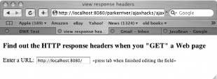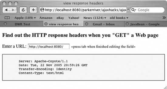However, you might want to see some of the other response headers associated with the request, such as the type of web server software associated with the response (the Server response header) or the content type of the response (the Content-Type header). This hack requests the user to enter a URL in a text field. When the user tabs out of or clicks outside of the text field, the browser displays various HTTP response headers. As usual with Ajax, this happens without a page refresh.