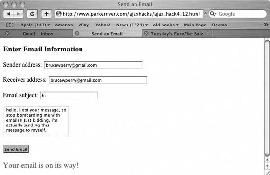 In this case, the user left a couple of letters off of the email suffix (the domain) in the second field. Our email-syntax checker in email_lib.js ensures that, among other things, email addresses end with a period followed by two to three characters. (For more validation rules, check out [Hack #23].) If the user's entries are valid, the Java servlet responds with an <outcome>true</outcome> message so that the application can notify the user that the email is on its way, as in Figure 4-22. Figure 4-22. All systems go for emailing