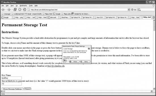 }The AMASS framework makes it possible to serialize entire JavaScript objects into the storage system, such as the keyValue object we serialized earlier. Note that DOM nodes and browser objects such as the XMLHttpRequest object will not be serialized. As mentioned earlier, applications can store up to 100K of data without user permission. After this, a pop-up is generated by the underlying Flash system that prompts the user for permission. The AMASS framework knows when the pop-up appears, generating a div and bringing the Flash file to the forefront of the application. Figure 4-12 shows the application centering the pop-up on the screen. Figure 4-12. Asking permission to store large data amounts