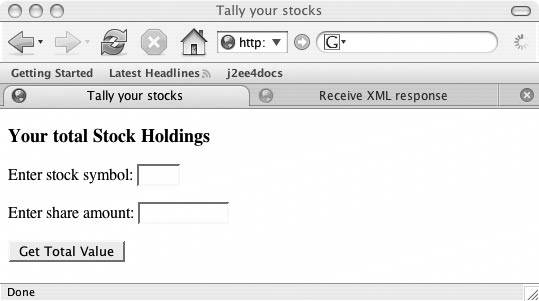 </html>When users load this file into their browsers, they see the screen shown in Figure 1-11. Figure 1-11. Request a stock's price