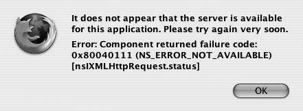 }Now, let's take a look at how this code handles the different types of exceptions previously enumerated. Floored ServerA try block traps any exceptions thrown within its curly braces ( {}). If the code throws an exception, this mechanism executes the code within the associated catch block. The inner try block, which is designed to manage exceptions thrown in the event of invalid numeric values, is explained in "Receive Data as a Number" [Hack #6]. So, what happens if the server host is completely down, even though the URL your application uses is otherwise correct? In this case, the code's attempt to access the request.status property throws an exception because the request object never receives the expected response header from the server and the status property is not associated with any data. As a result, the code displays the alert window defined in the outer catch block. Figure 1-12 depicts what the alert window looks like after this type of error. Figure 1-12. Uh-oh, server down