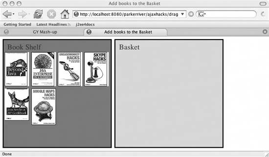Set up a book shelf from which users can drag books into a basket, with their choices logged on a server. This hack allows the user to drag an image of a book from one area of the page into another region of the view called the "basket." The book is then processed as though it was being purchased, and a small message appears from the server. The application sends the book information as an Ajax-style request, and the rest of the view does not change as this transaction takes place. The hack uses the Rico library's drag-and-drop functionality. This open source JavaScript library makes it fairly easy to designate some regions of the page as "drop zones" and other page elements as "draggable." Rico takes care of the underlying graphical programming, which is a real win for the developer. Figure 6-6 shows what the hack looks like in the Mac OS X version of Firefox 1.5. Figure 6-6. Tasteful book selection