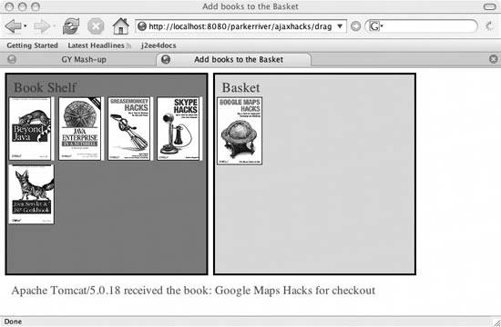 } );The methods are callback functions; in other words, the Rico library calls these methods at different stages of the object's drag behavior. The request trigger is when an object is dragged from the shelf to the basket and then dropped there. Watch what happens when you drag a book to the basket but do not drop it: an animation occurs (the zone darkens and shifts a bit), but the code does not send a request.