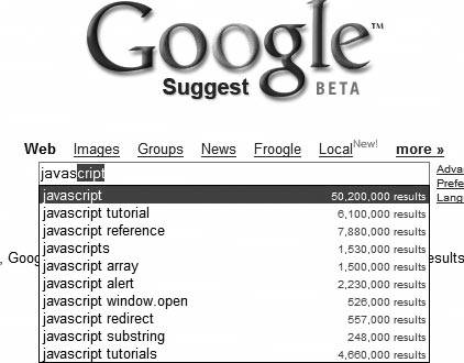 Give the user helpful suggestions by changing the contents of a text box as they type. Web surfers can always use a little help. Google took advantage of this fact when it created Google Suggest (http://www.google.com/webhp?complete= 1&hl=en), a simple Ajax variation on its massively popular search page. When the user types in a search term, Google Suggest displays a list of search suggestions beneath the text box. What many people don't notice is that the text in the text box is also alteredthe top entry from the list is automatically entered. Figure 9-12 shows this behavior in action: I've only typed the letters "javas" into the text box, but Google Suggest has added the end of the word, "cript," for me. Figure 9-12. Google makes suggestions