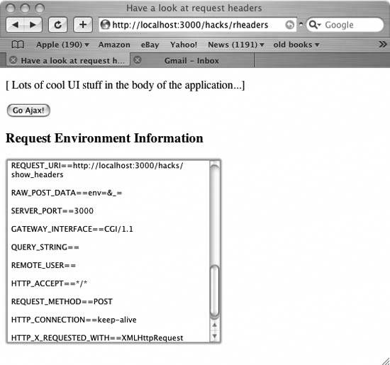 end #end classFirst, show_env checks whether the request actually involves XMLHttpRequest (see "Find Out Whether Ajax Is Calling in the Request" [Hack #59]). The action then uses the instance variable @request.env( ) method to iterate through each of the environment variables and store their values. The code then renders this string as the response. The response text ends up plunked inside the textarea. An important ease-of-use factor with this hack is that you never had to set up or deal at all with the innards of XMLHttpRequest; the Rails method submit_to_remote( ) takes care of that. Sweet! Hacking the HackIf the user clicks the Go Ajax! button more than once, the textarea's chunk of data is submitted in the request and ends up as a giant lump inside the RAW_POST_DATA environment variable. To avoid this problem, you can use code to clear the textarea's contents first each time the button is clicked: $('the_textarea').innerHTML="";