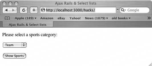 </html>This template calls the form_remote_tag( ) method to update the div positioned beneath the form tag. This method wraps all of the Ajax- and request objectrelated functionality, updating the div with server data and positioning any more information on top of or before any existing div content (as specified by the :position => "top" parameter). In other words, when the user clicks the Show Sports button, an XMLHttpRequest object is created, and its send( ) method sends a request to a Rails action named create_select. This action is defined as a Ruby method in the hacks_controller.rb file we peeked at before. The create_select action renders the HTTP response, which specifies the tags and content of a new pop-up or select list. Figure 7-10 shows the result of clicking the Show Sports button. Figure 7-10. Voil\x88 , up pops a select list