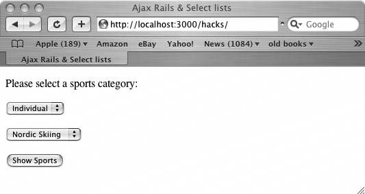 Generate a selection list from server-side data using Ajax and Ruby on Rails. This hack creates a select element from server-side data using a Ruby on Rails application. Unlike the typical manner in which a web widget is generated in a web page, the user chooses the content for the pop-up, and then the pop-up appears out of the blue, without anything else on the page changing. The selections that the user sees in the pop-up derive from a server-side component; they are not just hard-coded JavaScript or HTML that is part of the web page. This hack has the same behavior as some of our earlier hacks, but the path our code takes to produce its effects is quite different. A Rails application wraps all of the XMLHttpRequest mechanics behind its own methods. Figure 7-9 shows what the web page looks like. The user reaches this page by typing http://localhost:3000/hacks/ into a web browser's location field.