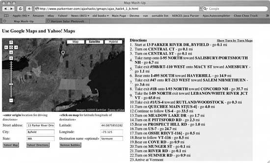 If the user requests driving directions, they appear in the right part of the screen, as in Figure 4-5. Figure 4-5. Marrying Google Maps and Yahoo! directions