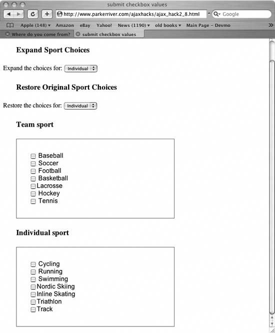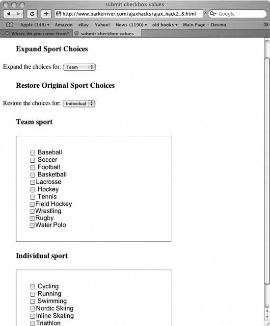 How Does It Work?We are assuming that the content for the new checkboxes must come from the server, because it changes often and/or derives from the organization's database. Otherwise, an application like this can just include a JavaScript array of new content and never touch the server program. When the user makes a choice from the first pop-up menu or select list, this action sends the choice of Team or Individual to a server program. The code uses the request object to connect with the server the Ajax way. The server replies with an array of titles for new checkboxes. Flipping the choices in the select list launches an onclick event handler in the JavaScript code, which the upcoming code sample shows. I won't take up space with the HTML code, because the page is almost exactly the same as the one in "Submit Checkbox Values to the Server Without a Round Trip" [Hack #17]. The page uses a script tag to import all its Ajax-related JavaScript in a file named hacks2_8.js. You can read through the code comments right now to get a feel for what the code does. Here is the relevant JavaScript code: var sportTyp = "";