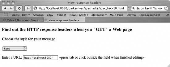 }Nudging Aside the StylesheetEach HTML element on a web page has a style property, if its host browser supports CSS stylesheets. For example, a div element has a property called div.style that allows a JavaScript writer to set inline style attributes for that div (as in div.style.fontFamily="Arial"). This is how the setStyle( ) function works in the prior code. The two function parameters are a style name such as "Fancy" (chosen from a predefined list) and the style property of a specific div element. The function then sets the appearance of the HTML div element on the web page. The information that appears on the page (a bunch of response headers) is derived from the server using the request object. As in the previous hack, the user completes a URL, then clicks outside the text field or presses the Tab key, thus firing an onblur event handler that sets the request object and CSS styling in motion. The HTML for the page is not much different from that in "Generate a Styled Message with a CSS File" [Hack #10], but it omits the link to a stylesheet. All the styling for this hack is defined by the imported JavaScript file, hack10.js. Here's the code: <!DOCTYPE HTML PUBLIC "-//W3C//DTD HTML 4.01//EN"