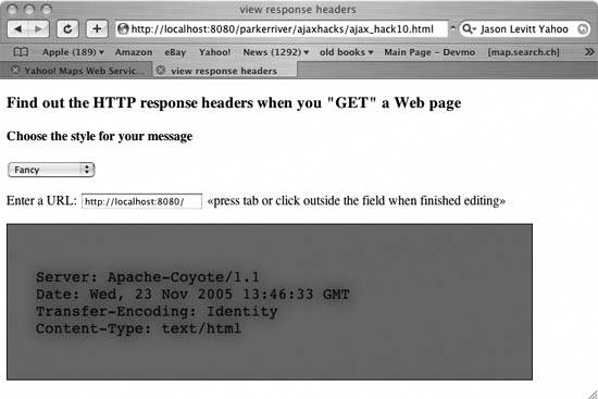 </html>The getAllHeaders( ) function, an event handler for onblur, passes in to the application the name of the style the user has chosen from a select list (such as "cosmo"), as well as the URL of the server component. The only purpose of the server component is to provide a value for display. We're mainly interested in dynamically generating styles for any type of server information your applications could acquire via Ajax and the request object.