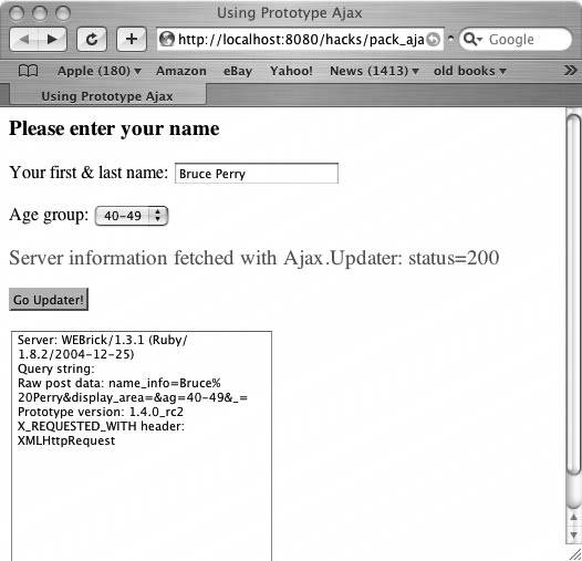The first order of business for this hack is to make sure that the web page imports the prototype.js library, which you can download from http://prototype.conio.net. Place this file in a common directory for JavaScript, then use a script tag to import the file into the web page: <script src="/javascripts/prototype.js" type="text/javascript"></script> <script src="/javascripts/mylib.js" type="text/javascript"></script> The second imported library, mylib.js, is where the hack uses the objects and extensions from the Prototype package. Here's the web page code that shows the various user interface controls that this hack depends on, including the Go Updater! button and the textarea that receives server data: <html>