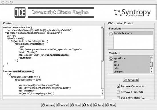 Take the JavaScript or HTML that you want to obfuscate (this hack obfuscates only the JavaScript), and paste it into the main window. Then click the Next button to display another screen that lets you choose which functions and variables to obfuscate. Figure 9-4 shows this screen. Figure 9-4. Scrambled code and home fries