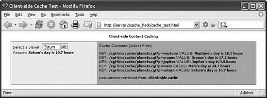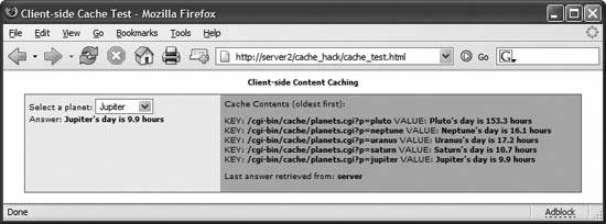 divAnswer.innerHTML = "Answer: <b>" +The async_cmd( ) function expects three parameters. The first two, url and parm, are the URL and parameters that make the XMLHttpRequest call. As the function name implies, the server call is asynchronous. When the server reply is received, the reponseText is copied into the HTML div tag specified by the third parameter, divname. The async_cmd( ) function also contains all the code for storing and retrieving data from the client-side cache. You don't need to know anything about how the cache works (or even that it exists) to use the function. The Cache in ActionIn the example program, a user selects a planet from the pull-down list, triggering the JavaScript function get_data( ), which in turn calls the function aync_cmd( ). The job of this function is to request information from the server and use it to update a div tag. But before it bothers the server, it first builds a cache keyan index into the cache arrayby combining the URL and parameters. The program then checks the cache for a matching entry: var cache_key = url + parms;