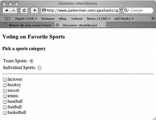</html>When the user clicks a checkbox, the page instantly displays either of two different sets of new checkboxes, representing either individual sports or team sports. The actual lists of sports that make up the checkboxes are arrays of strings that the server returns. They obviously could be hard-coded into the JavaScript to prevent a network hit, but the approach discussed in this hack is useful if the checkbox widgets represent values that change frequently and/or must be derived from persistent storage on the server (think product information, or complex multiple-choice questions in a questionnaire). Figure 2-13 shows the web page after the user has clicked a radio button. This action submits only the value associated with the radio button that the user clicked, not the entire form. Figure 2-13. Widgets spawning other widgets