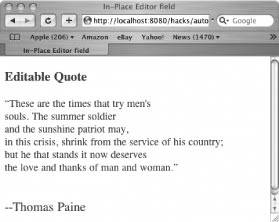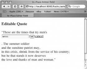 Allow users to edit text right in the web application, without experiencing any page refreshes or rebuilds. You might have used a wiki beforeit's a web page whose users can edit its content. script.aculo.us's Ajax.InPlaceEditor is an object that makes it very easy to specify any text on a web page as editable; it uses Ajax requests to handle any changed values. This hack's web page displays a quote from the old patriot Thomas Paine, but it allows the devilish user to edit the word "souls." Using the Ajax.InPlaceEditor object, the server component can look at the new value and decide whether to keep it. The user interacts with a text control; the code handles the server-related activity as Ajax requests in the background. Figure 8-5 shows what the web application looks like. Figure 8-5. Alter that quote!