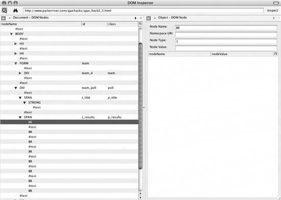 Figure 4-10 shows that an existing span element has new content in the form of BR tags and text nodes. If you click on a text node in the Inspector, the right side of the Inspector window shows the value of the node. This information can be invaluable for DOM programmers who are encountering a lot of text nodes, for example, that are empty strings. These empty nodes sprinkled throughout a page often pose difficulties for any code that iterates through the document nodes looking for specific nodes or structures. The DOM Inspector is a great tool for debugging Ajax applications, not to mention a handy way to examine the DOM structure of any web page and to learn about the available object properties and methods. |