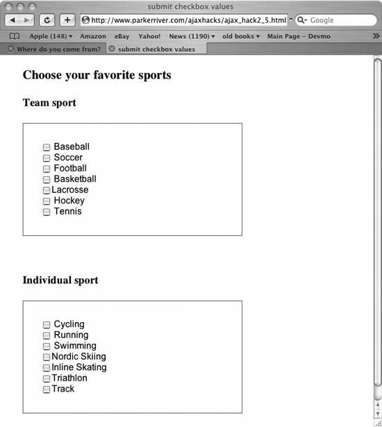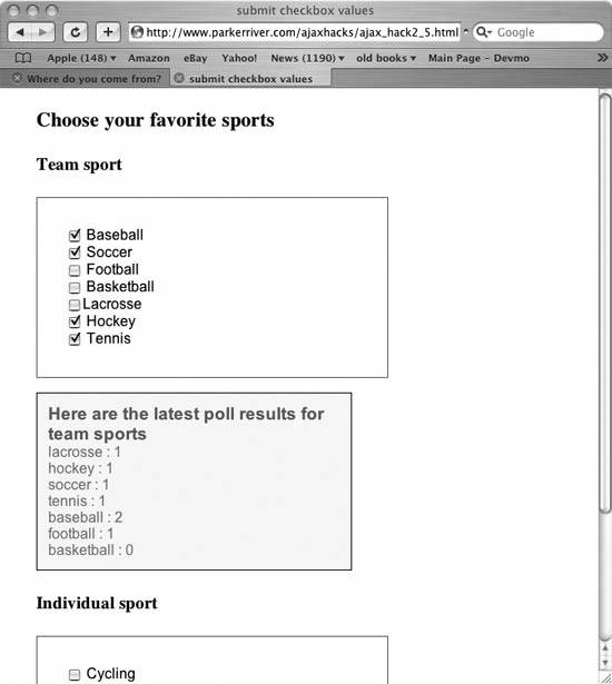 Generate immediate interaction with a server program when the browser user clicks a checkbox. Checkboxes are those little squares or buttons that allow users to make choices among multiple options. The conventional setup is for users to check one or more checkboxes as part of a form that they have to submit later. But what if you want your application to submit only the checkbox values, rather than the whole form, and have that submission take place when the user clicks the checkbox and not at some indeterminate time in the future? This hack represents a poll in which users vote for their favorite team and individual sports. When the browser user selects any of the checkboxes, this action triggers an event that submits this value to a server program and then displays the poll results. Figure 2-10 shows what the page looks like in a browser. Figure 2-10. Choose your favorite sports