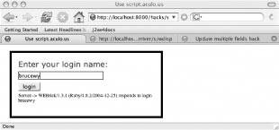 },10*1000); Effect.Appear( ) makes an element visible if the code initially sets its display CSS property to none: <div id="answer" class="answer" style="display:none;"></div> Just pass in the id of the element you want to reveal as a parameter. One sort of hackish way to make the visible element fade away again on a timer is illustrated in the prior code snippet. I used the window.setInterval( ) method to wait 10 seconds and then call Effect.Fade("answer"). The code then clears that interval immediately, so it calls Effect.Fade( ) only once. This generates the effect where the server message appears beneath the login button for 10 seconds, then fades away. Serve It UpThe server-side code is fairly trivial in the Ruby on Rails (RoR) framework: class HacksController < ApplicationController