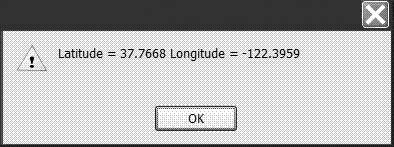 </html>Running this application makes a request to Yahoo!'s Geocoding web service and yields the alert box shown in Figure 9-5. The alert box displays the latitude and longitude of the zip code 94107. Figure 9-5. A coordinate from Yahoo's Geocoding web service
