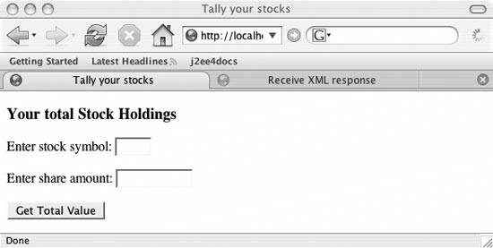 </html>When the user clicks the Get Total Value button, this action triggers the form element's onsubmit event. The event handler for this event is the getStockPrice( ) function. This function takes the stock symbol and the number of shares as its two parameters. The return false part of the event-handling code cancels the browser's typical submission of the form values to the URL specified by the form tag's action attribute. Number CrunchingNow let's look at the JavaScript code, which the HTML file imports as part of the hack4.js file: var request;