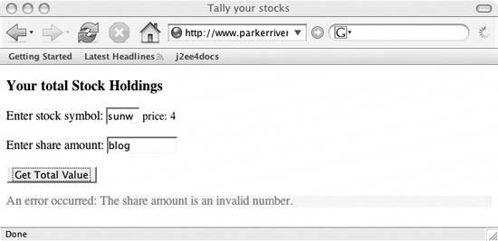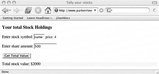 }Figure 1-7 shows what the page looks like when the user requests a stock value. Figure 1-7. Tallying your investment