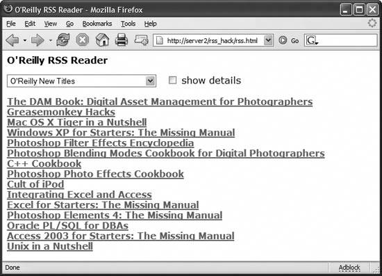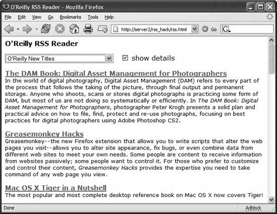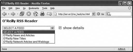 http://www.oreillynet.com/pub/feed/29?format=rss2Figure 4-24 shows the simple user interface of our RSS reader: a pull-down list to select the RSS feed, and a checkbox to let users select more details for each article displayed. Figure 4-24. A simple RSS feed reader