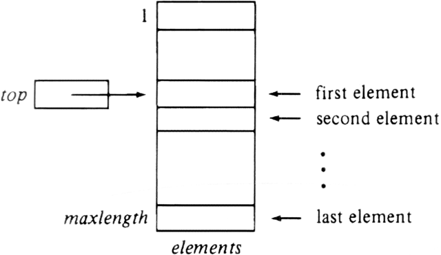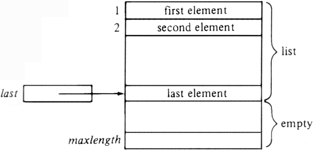 In the array implementation we define the type LIST to be a record having two fields. The first field is an array of elements whose length is sufficient to hold the maximum size list that will be encountered. The second field is an integer last indicating the position of the last list element in the array. The i th element of the list is in the ith cell of the array, for 1 £ i £ last, as shown in Fig. 2.2. Positions in the list are represented by integers, the ith position by the integer i. The function END(L) has only to return last + 1. The important declarations are: