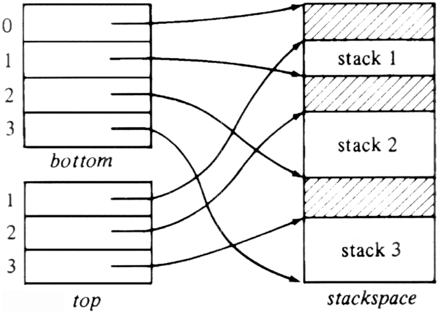 | 2.21 | It is possible to keep two stacks in a single array, if one grows from position 1 of the array, and the other grows from the last position. Write a procedure PUSH(x, S) that pushes element x onto stack S, where S is one or the other of these two stacks. Include all necessary error checks in your procedure. |