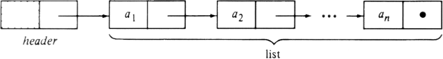 i = 1, 2 , . . . , n-1. The cell holding an has a nil pointer. There is also a header cell that points to the cell holding a1; the header holds no element. In the case of an empty list, the header's pointer is nil, and there are no other cells. Figure 2.4 shows a linked list of this form.Fig. 2.4. A linked list.