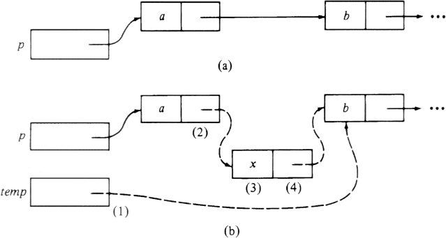 The mechanics of the pointer manipulations of the INSERT procedure in Fig. 2.6 are shown in Fig. 2.7. Figure 2.7(a) shows the situation before executing INSERT. We wish to insert a new element in front of the cell containing b, so p is a pointer to the list cell that contains the pointer to b. At line (1), temp is set to point to the cell containing b. At line (2) a new list cell is created and the next field of the cell containing a is made to point to this cell. At line (3) the element field of the newly-created cell is made to hold x, and at line (4) the next field is given the value of temp, thus making it point to the cell containing b. Figure 2.7(b) shows the result of executing INSERT. The new pointers are shown dashed, and marked with the step at which they were created.