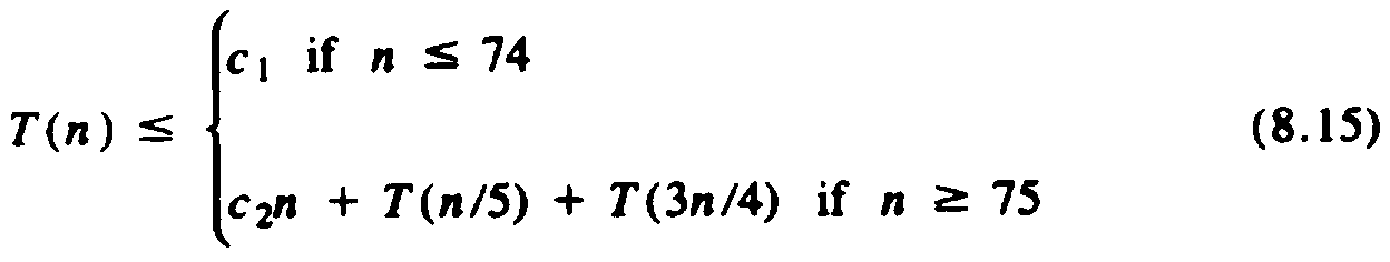 Equation (8.15) can be solved by guessing a solution and verifying by induction that it holds for all n. We shall chose a solution of the form cn, for some constant c. If we pick c ³ c1, we know T(n) £ cn for all n between 1 and 74, so consider the case n ³ 75. Assume by induction that T(m) £ cm for m<n. Then by (8.15),