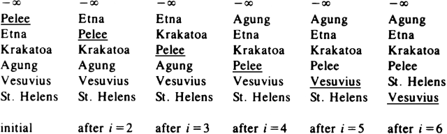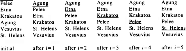 At the start of the first pass, St. Helens bubbles past Vesuvius, but not past Agung. On the remainder of that pass, Agung bubbles all the way up to the top. In the second pass, Etna bubbles as far as it can go, to position 2. In the third pass, Krakatoa bubbles past Pelee, and the list is now in lexicographically sorted order although according to the algorithm of Fig. 8.1, two additional passes are made.
