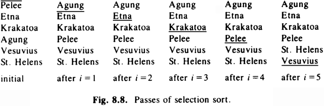 Example 8.3. The passes of selection sort on the list of Fig. 8.3 are shown in Fig. 8.8. For example, on pass 1, the ultimate value of lowindex is 4, the position of Agung, which is swapped with Pelee in A[1].