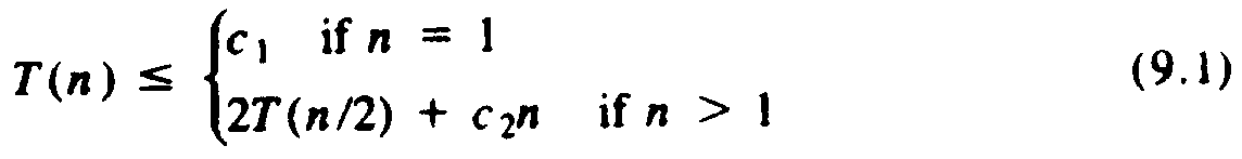 The term c1 in (9.1) represents the constant number of steps taken when L has length 1. In the case that n > 1, the time taken by mergesort can be divided into two parts. The recursive calls to mergesort on lists of length n/2 each take time T(n/2), hence the term 2T(n/2). The second part consists of the test to discover that n ¹ 1, the breaking of list L into two equal parts and the procedure merge. These three operations take time that is either a constant, in the case of the test, or proportional to n for the split and the merge. Thus the constant c2 can be chosen so the term c2n is an upper bound on the time taken by mergesort to do everything except the recursive calls. We now have equation (9.1).