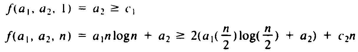 Let us turn our attention to (9.5) rather than its generalizations. Suppose we guess a function f(a1, . . . , aj, n), where a1, . . . , aj are parameters, and attempt to prove by induction on n that T(n) £ f(a1, . . . , aj, n). For example, our guess in Example 9.1 was f(a1, a2, n) = a1nlogn + a2, but we used a and b for a1 and a2. To check that for some values of a1, . . . , aj we have T(n) £ f(a1, . . . , aj, n) for all n ³ 1, we must satisfy