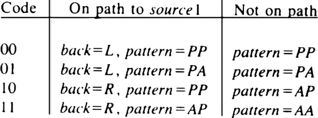 Fortunately, there is a clever algorithm, known as the Deutsch-Schorr-Waite Algorithm, for doing the marking "in place." The reader should convince himself that the sequence of cells upon which a call to dfs has been made but not yet terminated indeed forms a path from source to the cell upon which the current call to dfs was made. Thus we can use a nonrecursive version of dfs, and instead of a stack of activation records to record the path of cells from source to the cell currently being examined, we can use the pointer fields along that path to hold the path itself. That is, each cell on the path, except the last, holds in either the left or right field, a pointer to its predecessor, the cell immediately closer to source. We shall describe the Deutsch-Schorr-Waite algorithm with an extra, one-bit field, called back. Field back is of an enumerated type (L, R), and tells whether field left or field right points to the predecessor. Later, we shall discuss how the information in back can be held in the pattern field, so no extra space in cells is required.