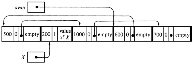 The reader should, as an exercise, discover how to maintain the pointers when a block is split into two; presumably one piece is used for a new data item, and the other remains empty.