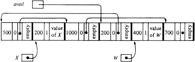 Example 12.6. Suppose we need 400 bytes for variable W in the situation represented by Fig. 12.12. We might choose to take the 400 bytes out of the 600 in the first block on the available list. The situation would then be as shown in Fig. 12.14.