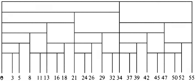 Example 12.8. Matters are not so simple for buddy systems of order higher than 0. Figure 12.15 shows the Fibonacci buddy system used in a heap of size 55, with blocks of sizes s1, s2, . . ., s8 = 2, 3, 5, 8, 13, 21, 34, and 55. For example, the block of size 3 beginning at 26 is buddy to the block of size 5 beginning at 21; together they comprise the block of size 8 beginning at 21, which is buddy to the block of size 5 beginning at 29. Together, they comprise the block of size 13 starting at 21, and so on.