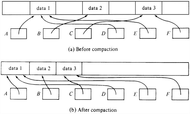 The typical problem we face is to take a collection of blocks in use, as suggested by Fig. 12.16(a), each of which may be of a different size and pointed to by more than one pointer, and slide them left until all available space is at the right end of the heap, as shown in Fig. 12.16(b). The pointers must continue to point to the same data as before, naturally.