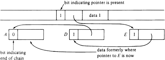 F. L. Morris discovered a method for compacting a heap without using space in blocks for forwarding addresses. It does, however, require an endmarker bit associated with each pointer and with each block to indicate the end of a chain of pointers. The essential idea is to create a chain of pointers emanating from a fixed position in each full block and linking all the pointers to that block. For example, we see in Fig. 12.16(a) three pointers, A, D, and E, pointing to the leftmost full block. In Fig. 12.18, we see the desired chain of pointers. A chunk of the data of size equal to that of a pointer has been removed from the block and placed at the end of the chain, where pointer A used to be.