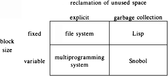 In the four examples above, we can see differences along at least two orthogonal "dimensions." The first issue is whether objects sharing storage are or are not of equal length. In the first two examples, Lisp programs and file storage, the objects, which are Lisp cells in one case and blocks holding parts of files in the other, are of the same size. This fact allows certain simplifications of the memory management problem. For example, in Lisp implementation, a region of memory is divided into spaces, each of which can hold exactly one cell. The management problem is to find empty spaces to hold newly-created cells, and it is never necessary to store a cell in such a position that it overlaps two spaces. Similarly, in the second example, a disk is divided into equal sized blocks, and each block is assigned to hold part of one file; we never use a block to store parts of two or more files, even if a file ends in the middle of a block.