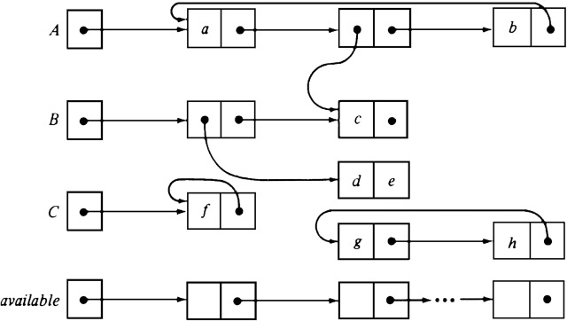 Example 12.2. In Fig. 12.3 we see a possible structure. A, B, and C are variables; lower case letters represent atoms. Notice some interesting phenomena. The cell holding atom a is pointed to by the variable A and by another cell. The cell holding atom c is pointed to by two different cells. The cells holding g and h are unusual in that although each points to the other, they cannot be reached from any of the variables A, B, or C, nor are they on the available space list.