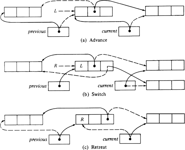 The second state is entered whenever we retreat, or when we cannot stay in the advancing state because we are blocked. In the retreating state we check whether we have retreated back to the dummy cell source1. As discusssed before, we shall recognize this situation because previous = current, in which case we go to state 3. Otherwise, we decide whether to retreat and stay in the retreating state or switch and enter the advancing state. The code for nrdfs is shown in Fig. 12.9. It makes use of functions blockleft, blockright, and block, which test if the left or right fields of a cell, or both, have an atom or null pointer. block also checks for a marked cell.
