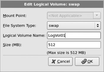 Change the Logical Volume Name to root, and change the size to a value that is closer to the size of the installation. I recommend 8,000 MB (i.e., 8 GB; most server and desktop systems will take 26 GB of space to install, so 8 GB gives a modest amount of headroom). Click OK when you are done. Figure 1-21 shows the settings that repeat the process for the other predefined LV: click on this LV and then click Edit. Change the Logical Volume Name to swap, leaving the size at the default value. Click OK when you are done. Figure 1-21. Edit Logical Volume window for the swap LV