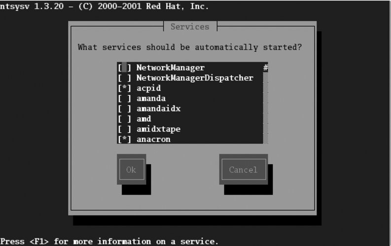 The configuration of the current runlevel is shown by default. Every service with a checkmark in front of it will be started when that runlevel is entered; to add or clear a checkmark, click on the checkbox. Click on a service name to see a description of that service and its current status (running or stopped). Click on the Save icon (or File You can edit the settings for another runlevel (3, 4, 5, or all three at the same time) using options on the Edit Runlevel menu. To start, stop, or restart a service immediately, regardless of whether it's configured to start automatically at boot time, click on the service name and then click on the Start, Stop, or Restart icon. 4.6.1.1. Configuring services using a character user interfaceIf you're not running a graphical user interface, you can use ntsysv, a character-mode program similar to system-config-services: # ntsysv